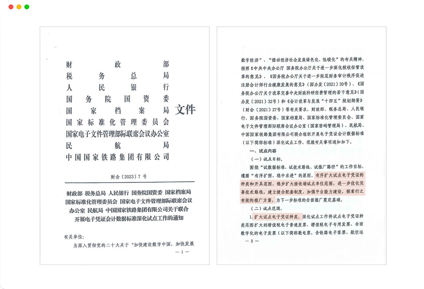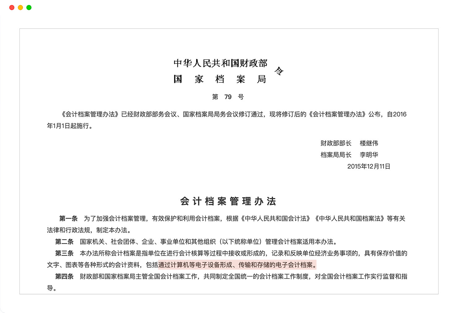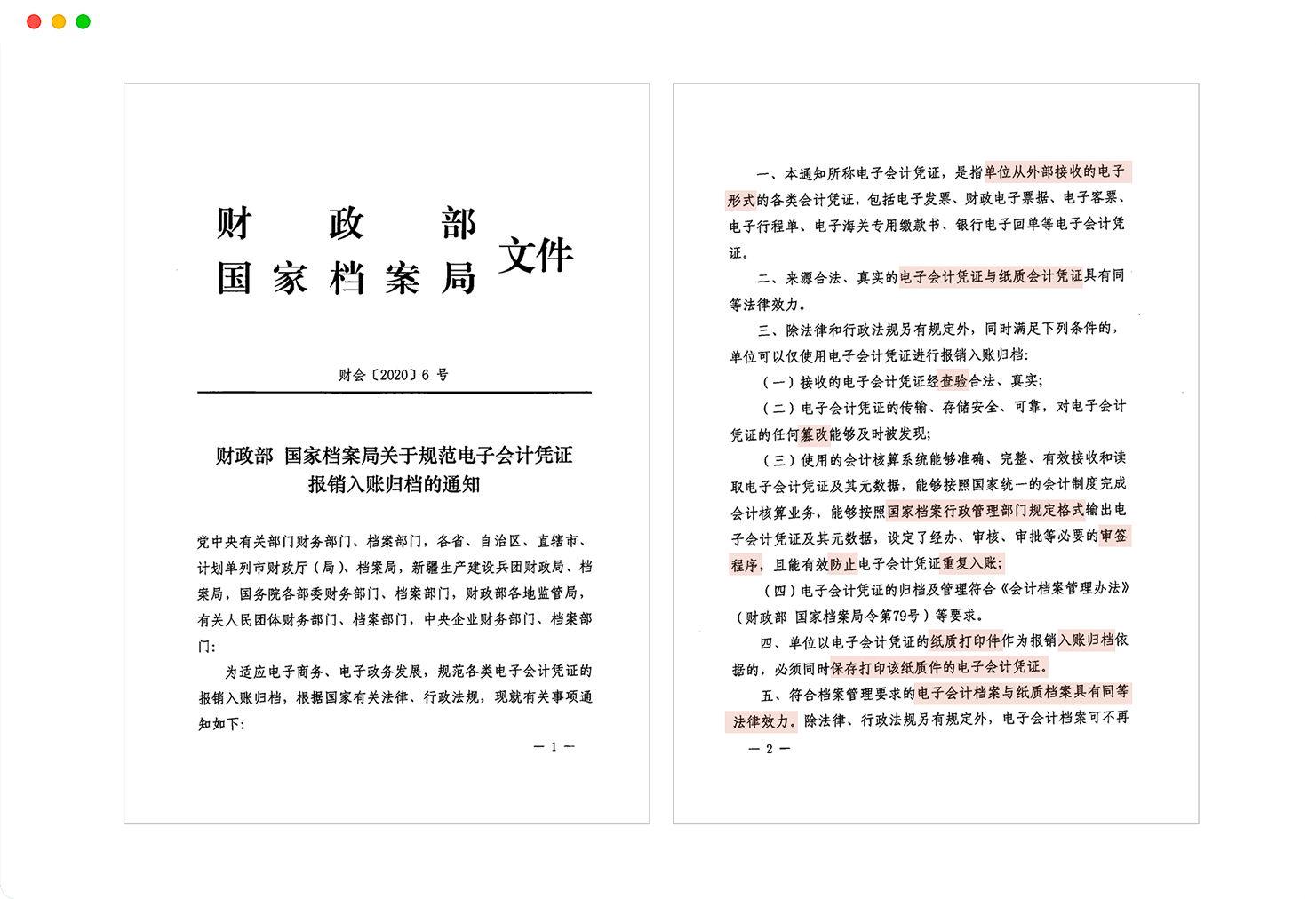 财政部公布财会6号文《关于规范电子会计凭证报销入账归档的通知》,明确指出来源合法、真实的电子会计凭证与纸质凭证具有同等法律效力。