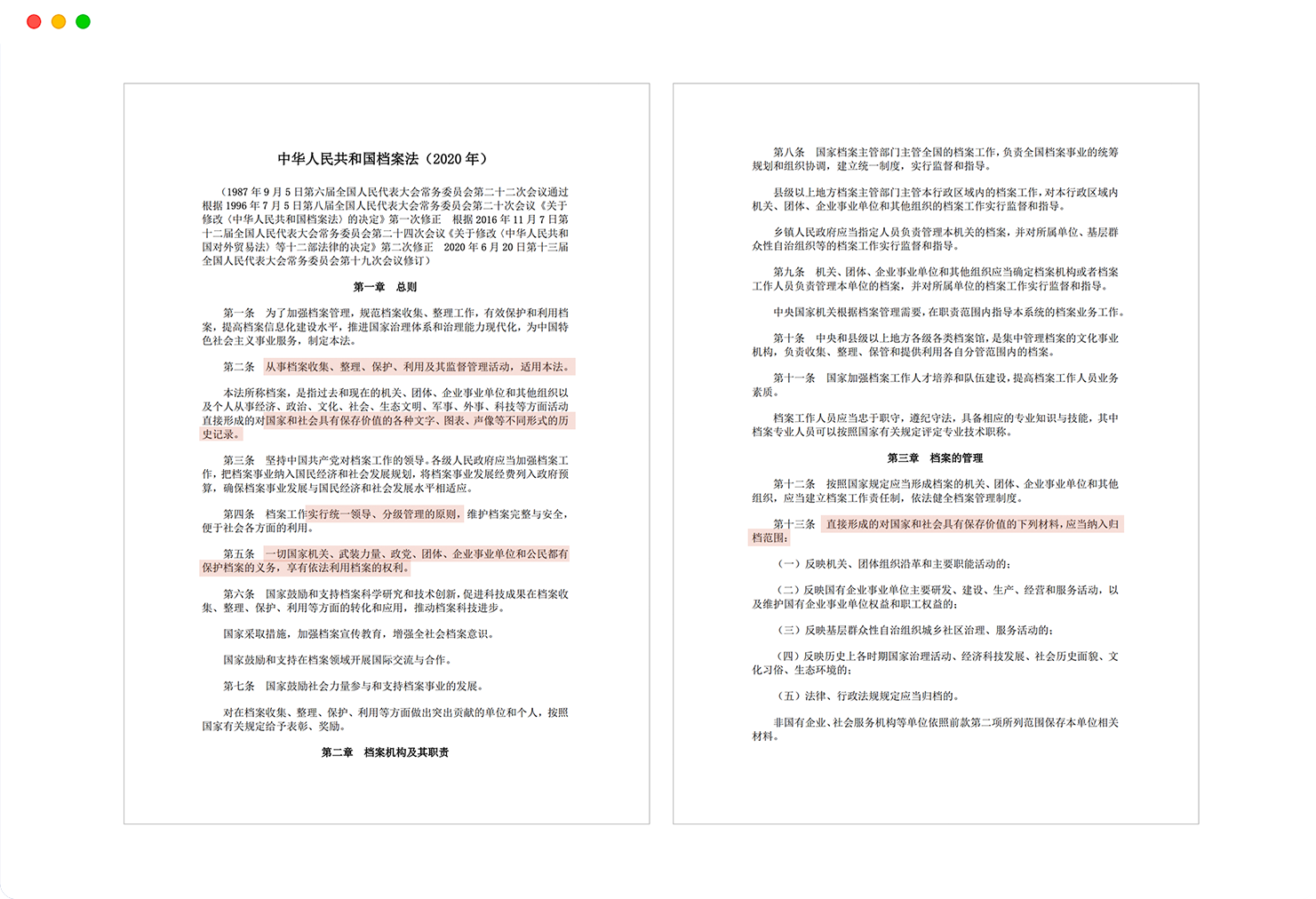《中华人民共和国档案法》对档案机构及其职责、档案的管理、利用、公布、信息化建设、监督检查、法律责任等做了明确规定,竝进一步明确了电子档案与传统载体档案具有同等法律效力。