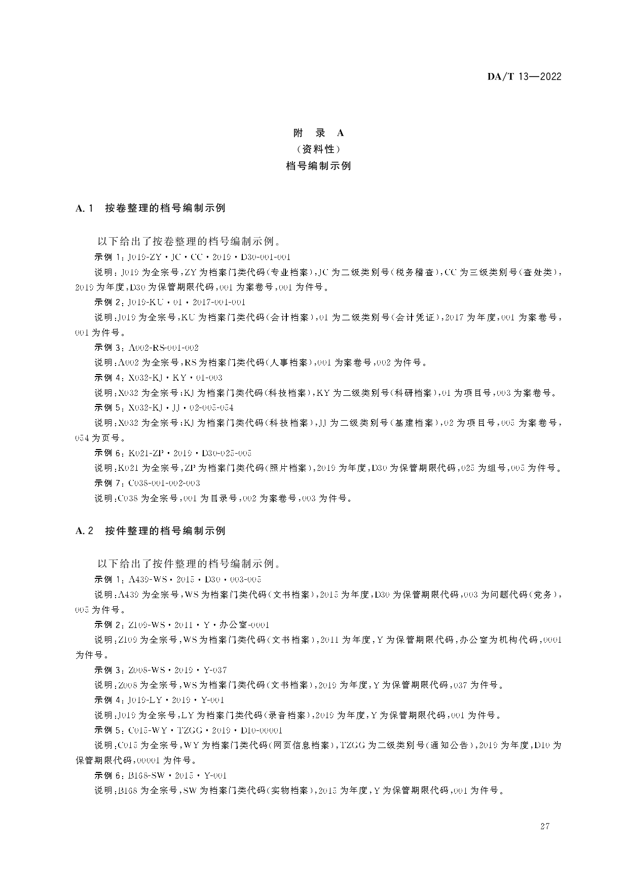 档案门类代码:2 位大写字母(WS 文书、KJ 科技、KU 会计等)
