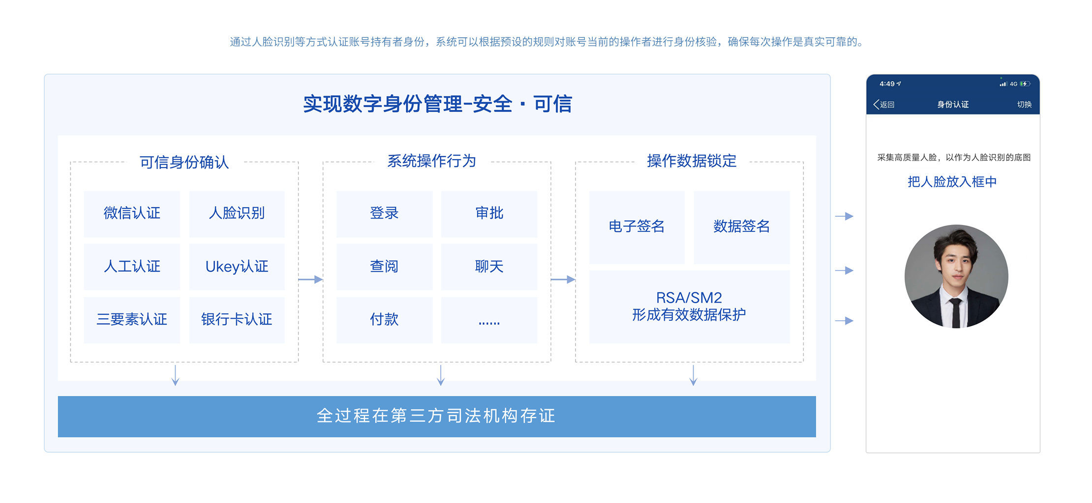 以权威数字身份证书为支撑,通过严密的真实身份认证手段为“用户”提供可信数字身份证明,保障系统的登录使用安全。