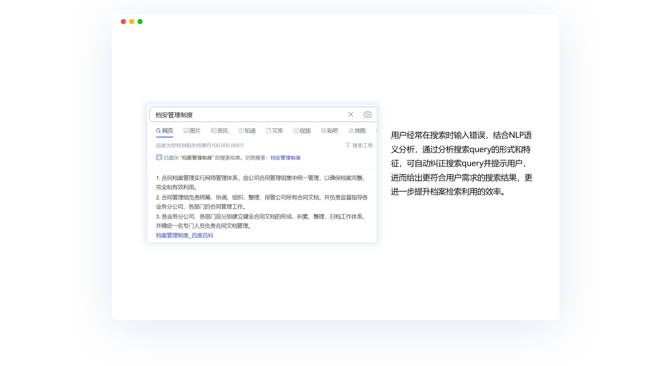 用户经常在搜索 时输入错误,结合NLP语义分析,通过分析搜索query的形式和特征,可自行纠正搜索query并提示用户,进而给出更符合用户需求的搜索结果,更进一步提升档案检索利用的效率。