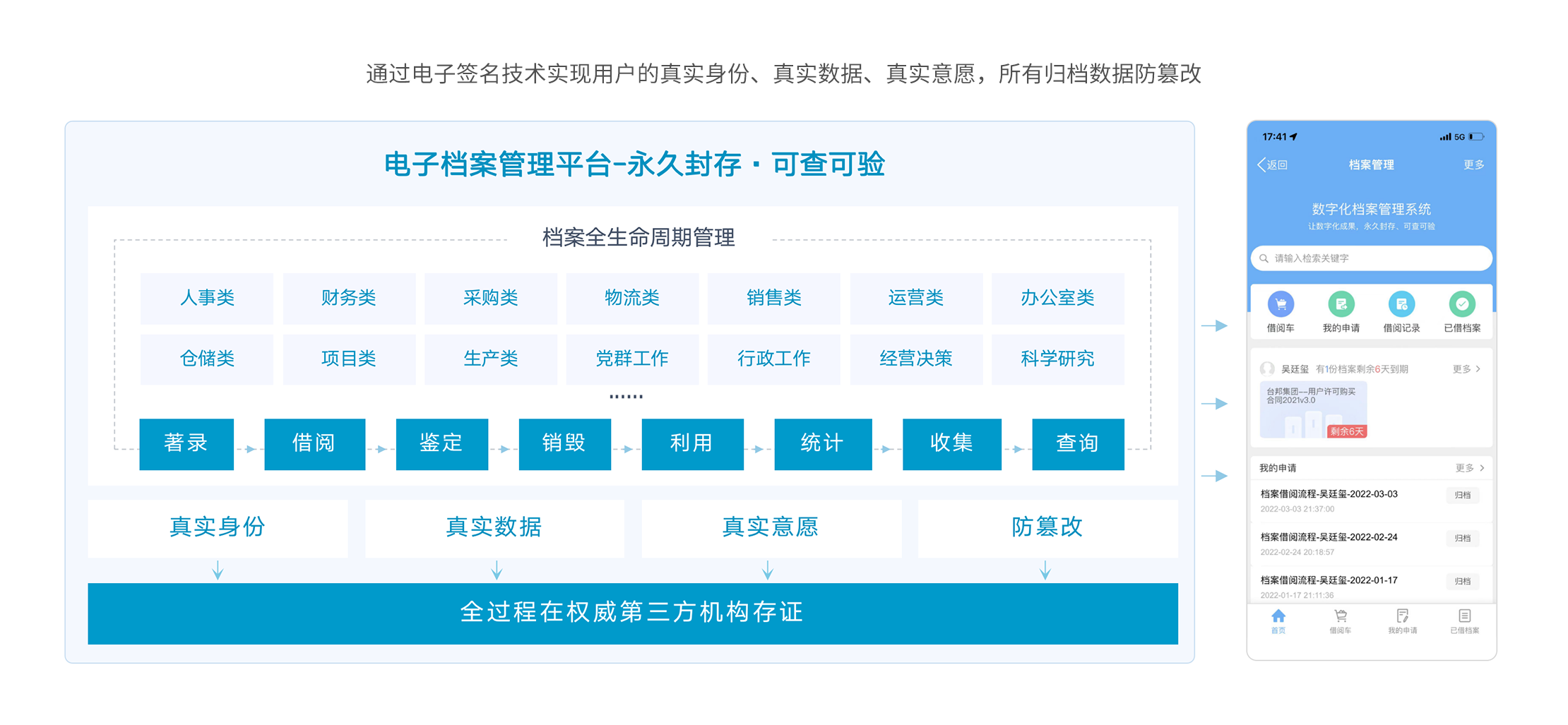 利用电子签名技术,对所有存在的文件数据进行加密,让电子档案文件、系统操作日志、用户行为日志等具有防篡改能力。