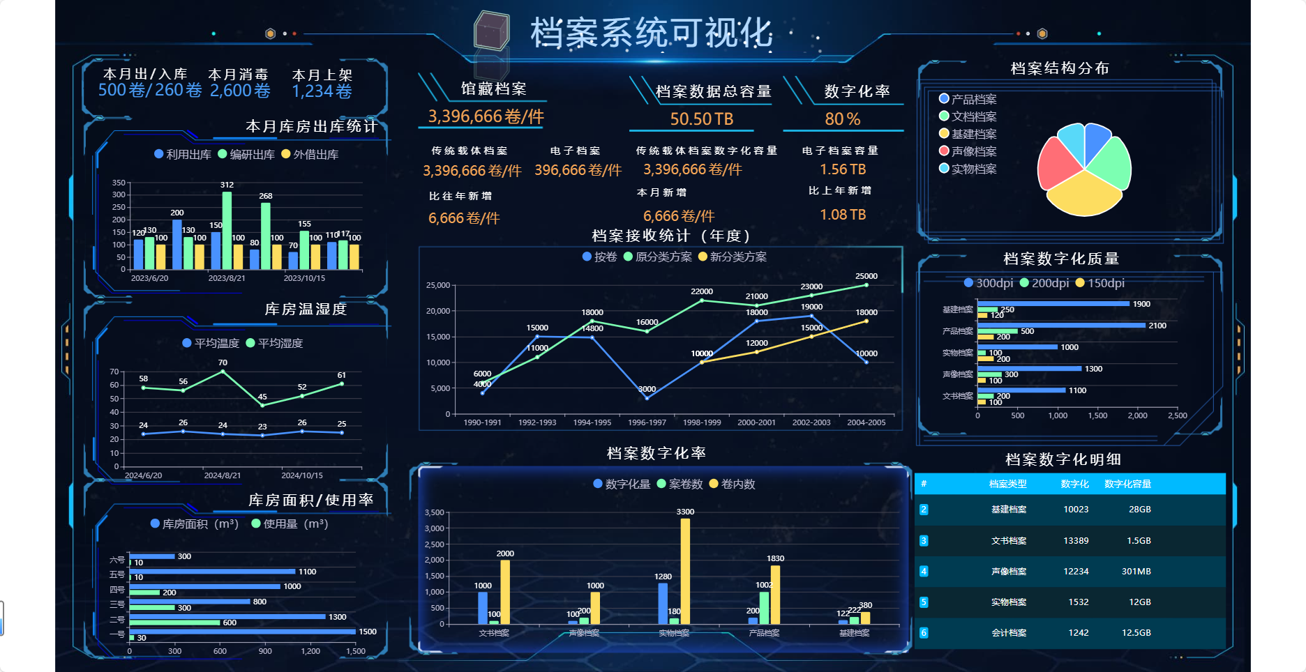 档案工作开展过程中所产生的数据,但凡是在系统中操作过的记录,最终都能进行统计汇总,结合数据中心,以表格或图表的方式直观呈现。
